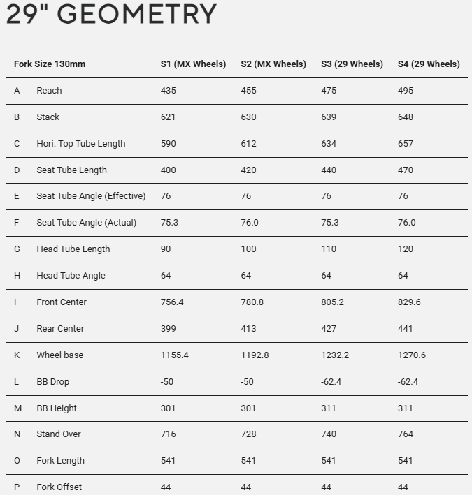 Le taglie più piccole (S1 & S2) utilizzano una configurazione ruote MX, mentre le S3 & S4 sono full 29”. Questa suddivisione permette di mantenere il corretto rapporto tra front-centre e rear-centre e preservare le caratteristiche di guida previste su tutte le taglie.